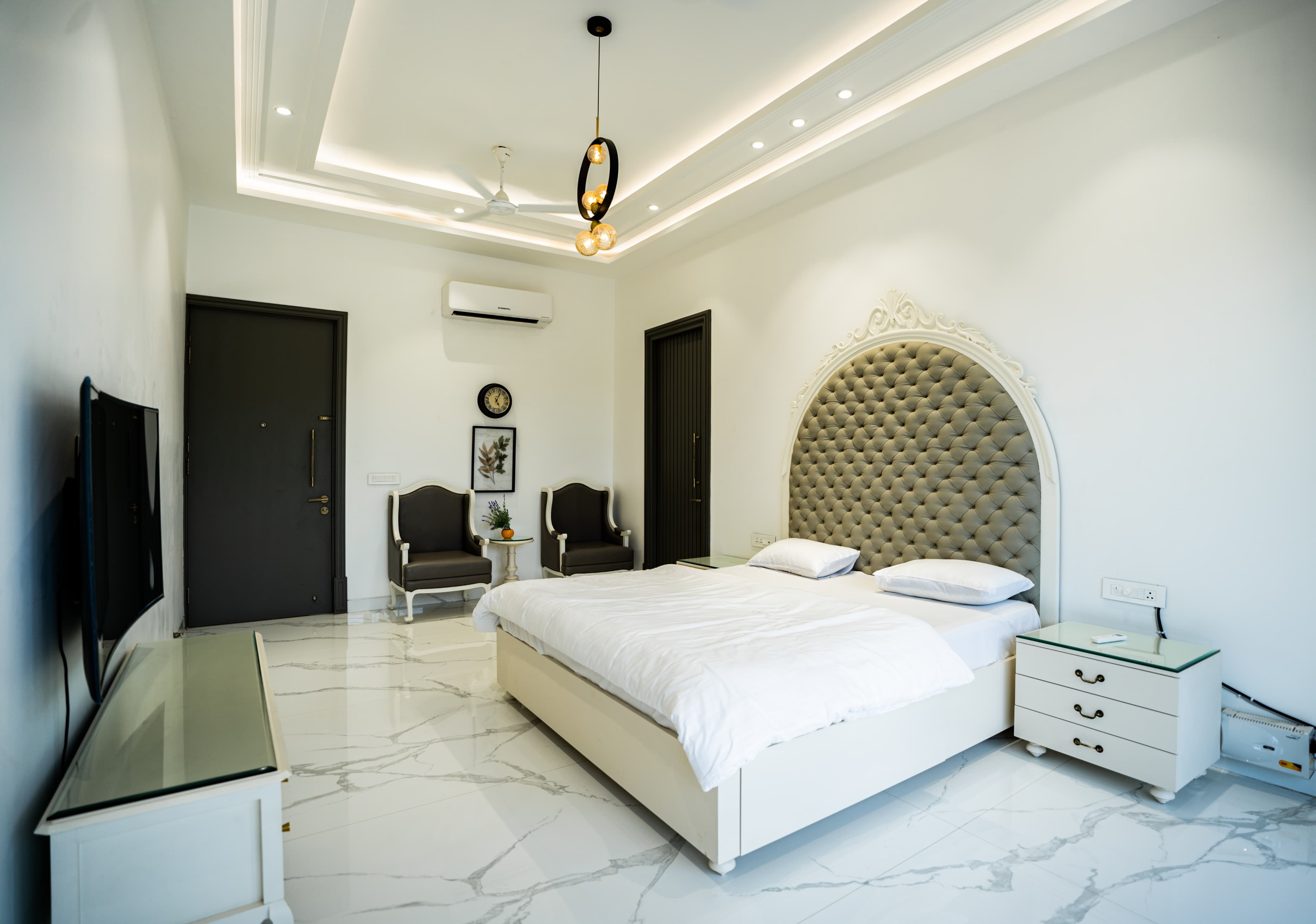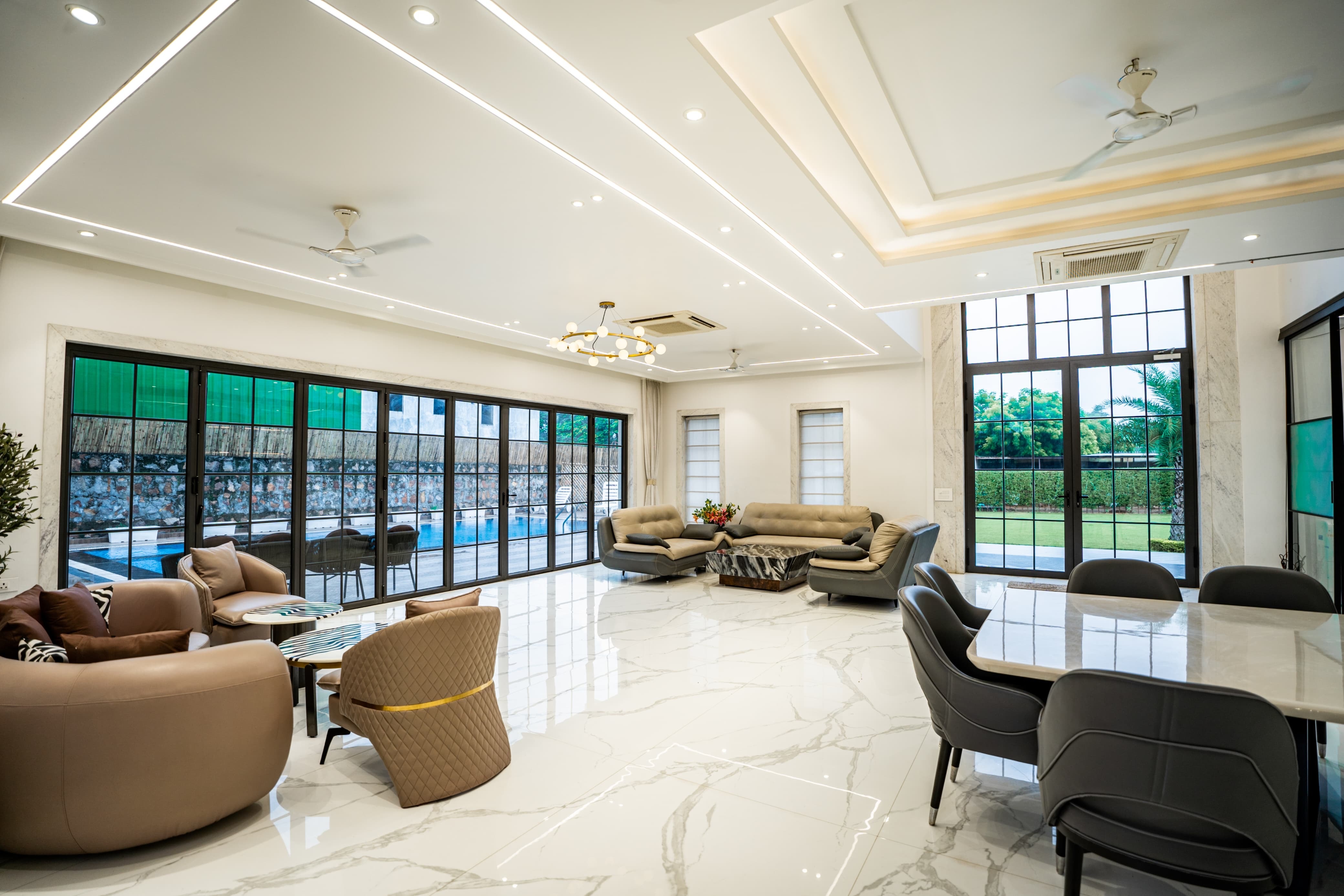 Escape to a lush green 5Bhk paradise offering a pool, boasting a scenic view. Enjoy the convenience of a fully equipped kitchen and all basic amenities, creating a perfect blend of entertainment, relaxation, and comfort for an unforgettable stay.