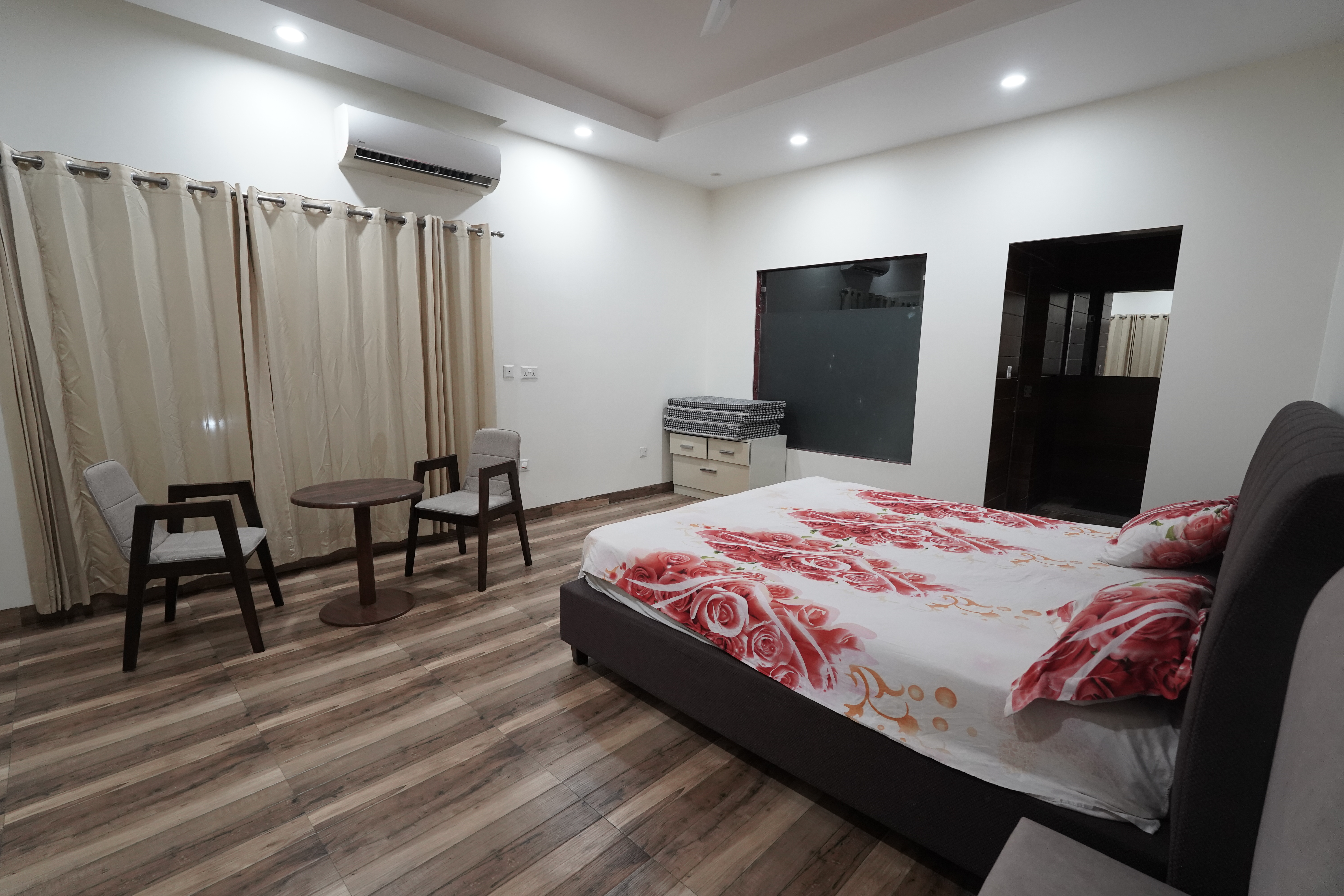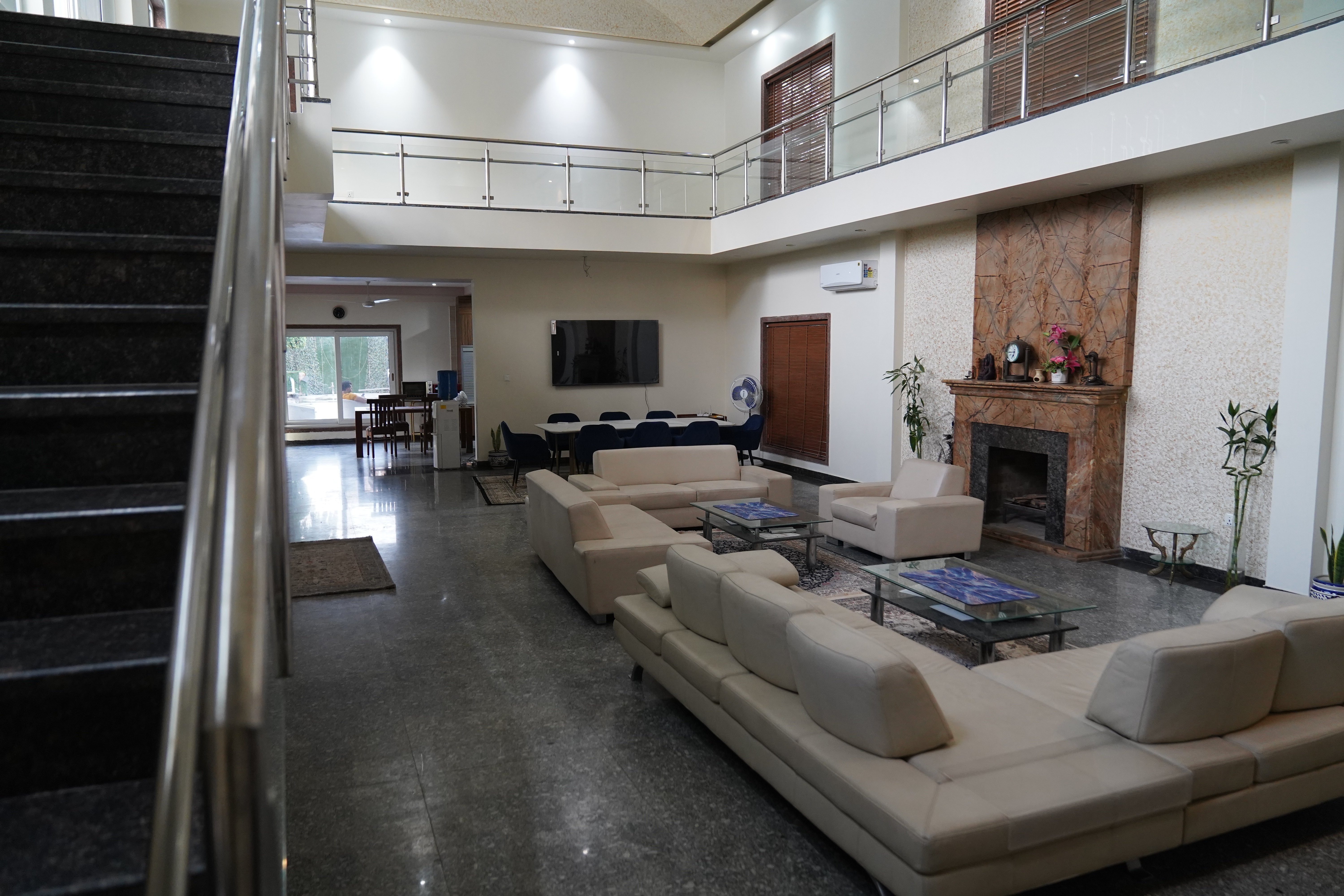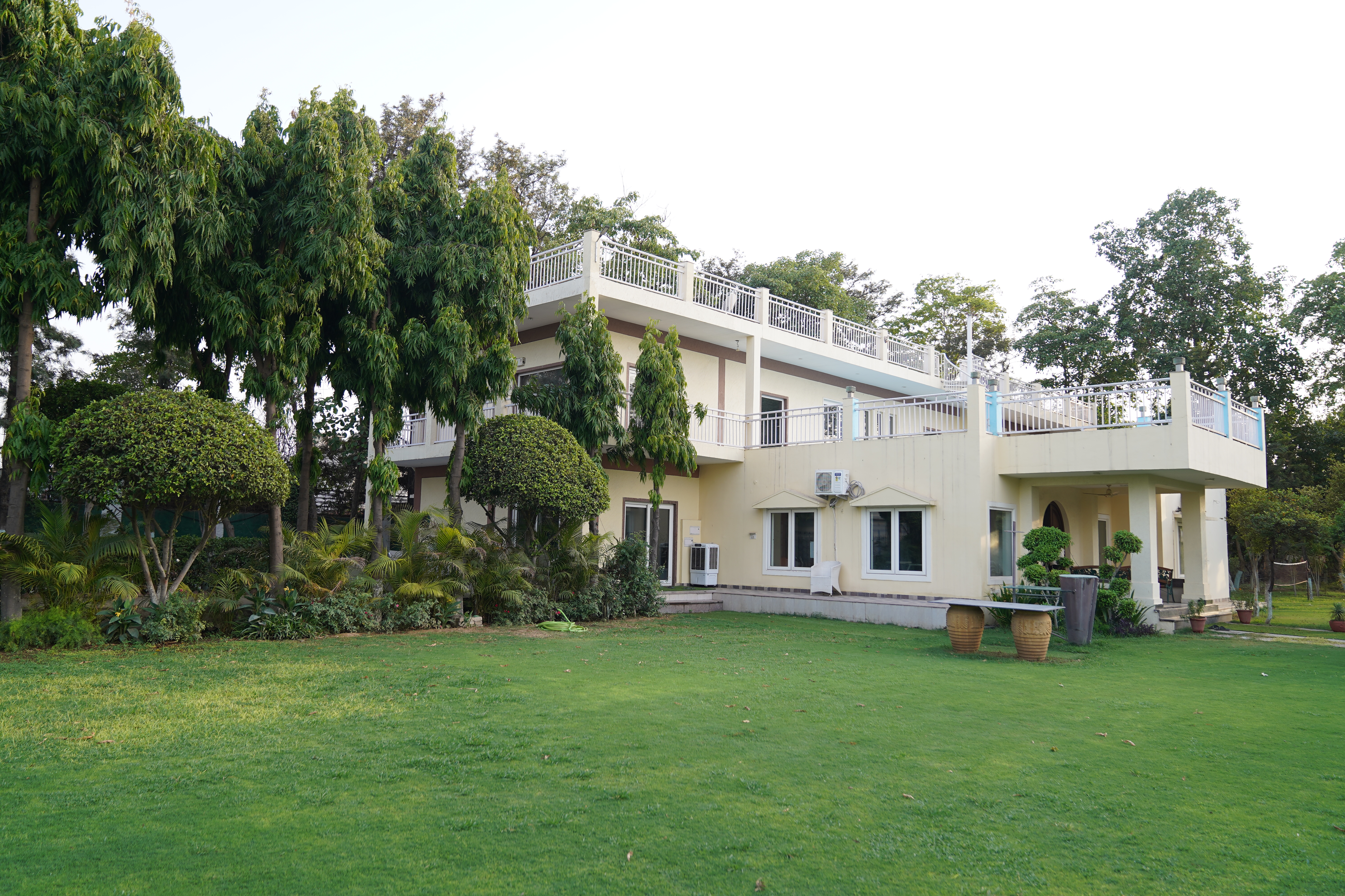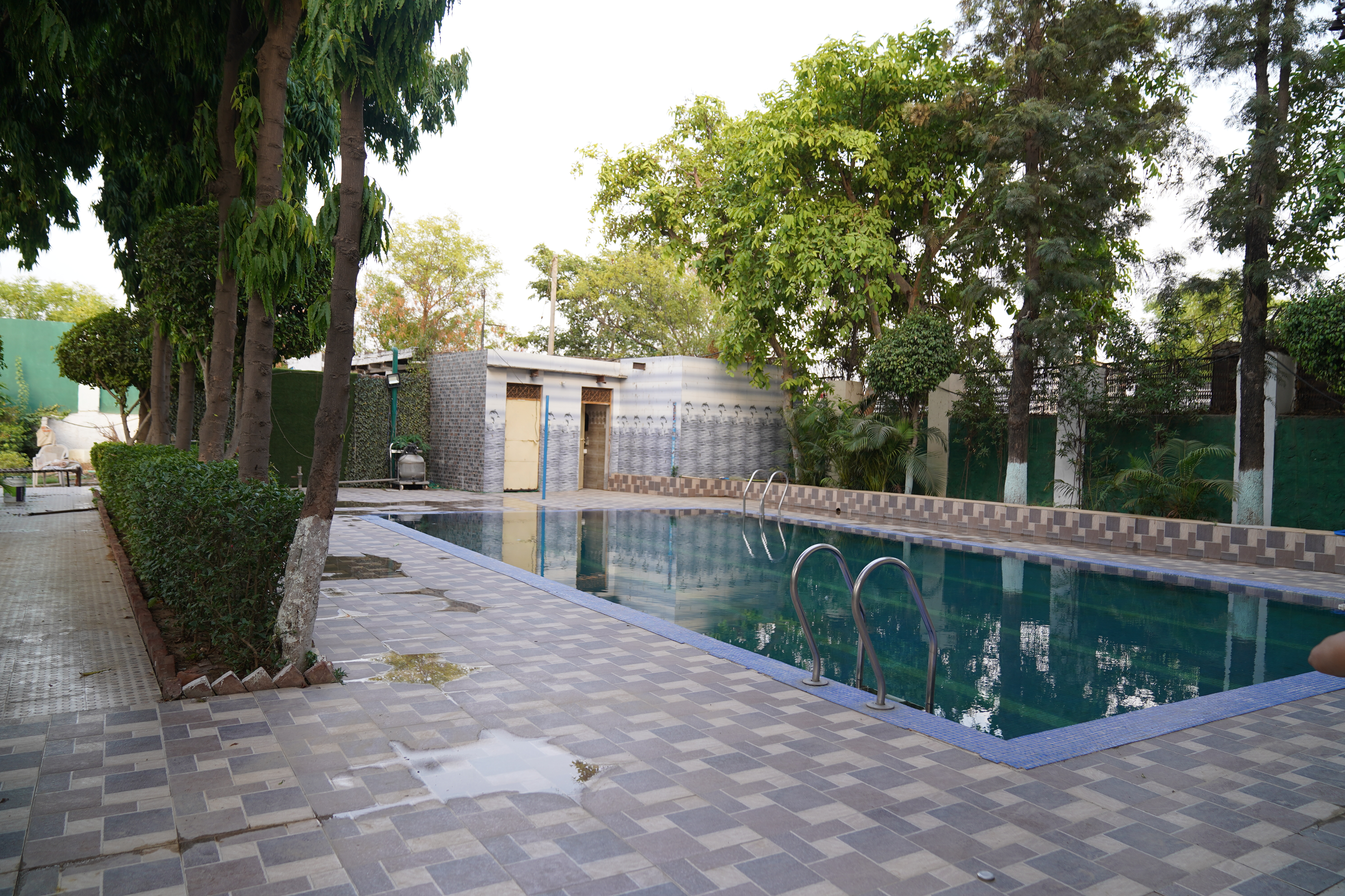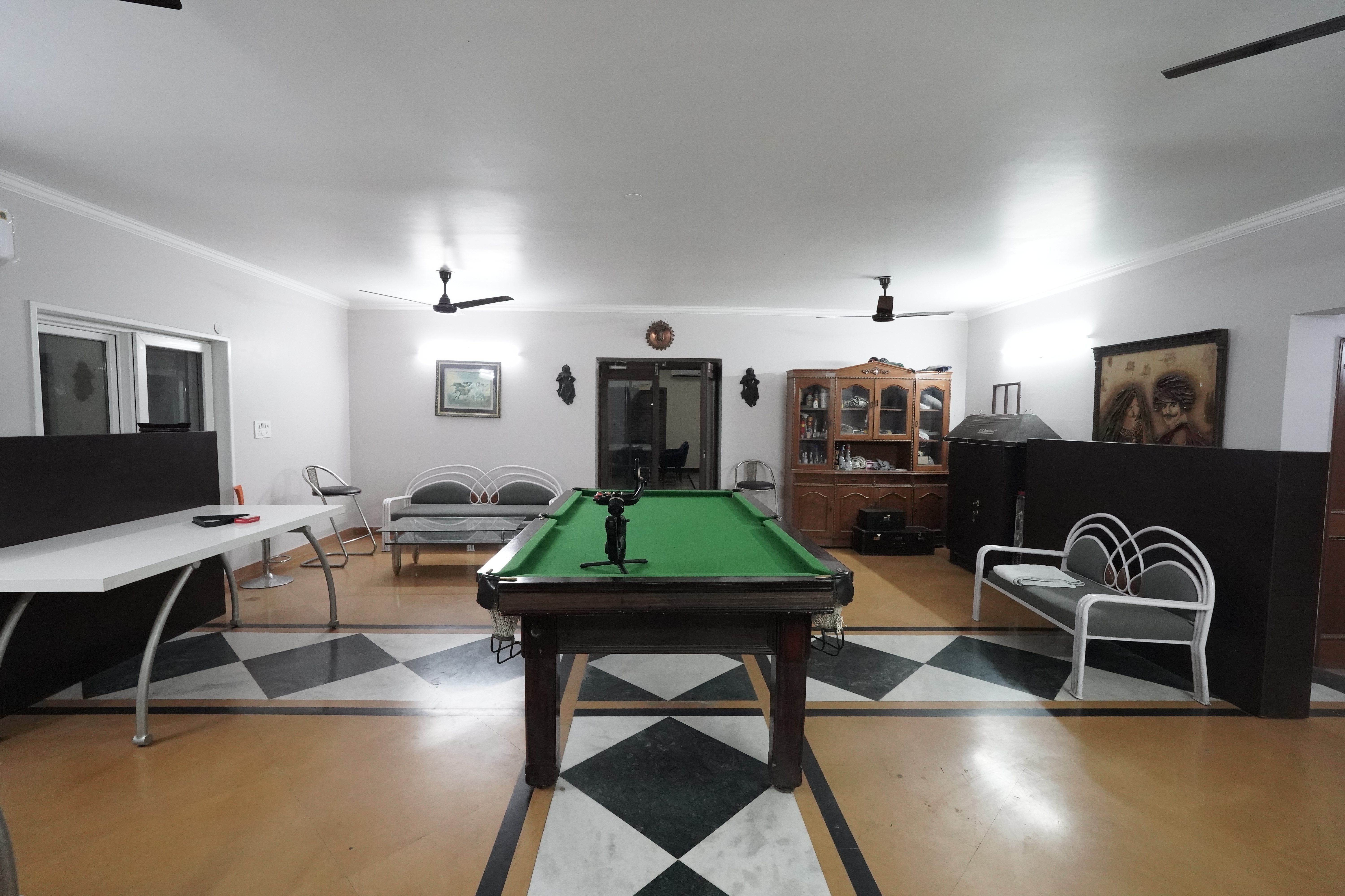 Indulge in luxury at this exquisite 5Bhk pool property, featuring a lush green lawn, a snooker table, a fully equipped kitchen, a poolside area, a spacious living room, and all essential