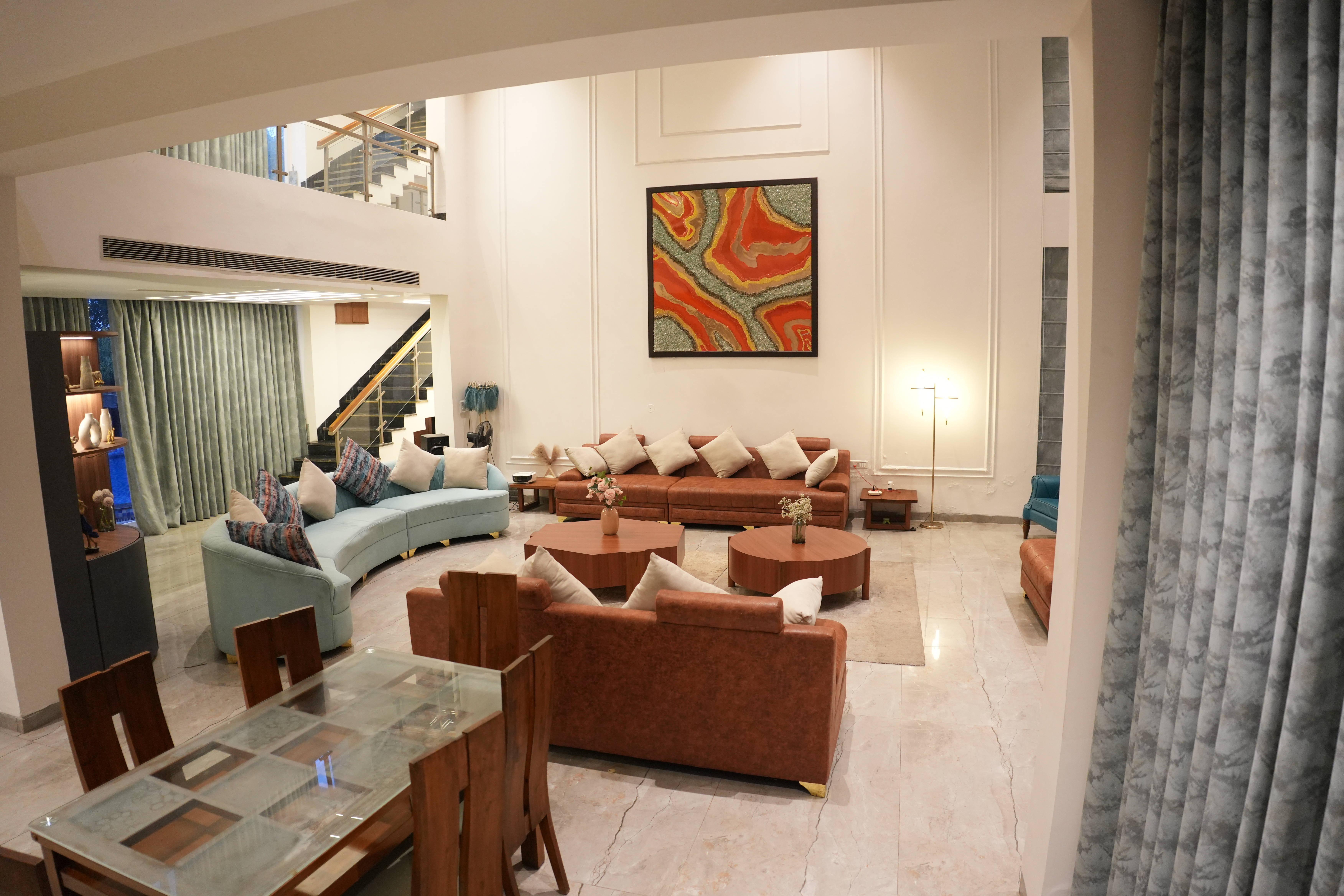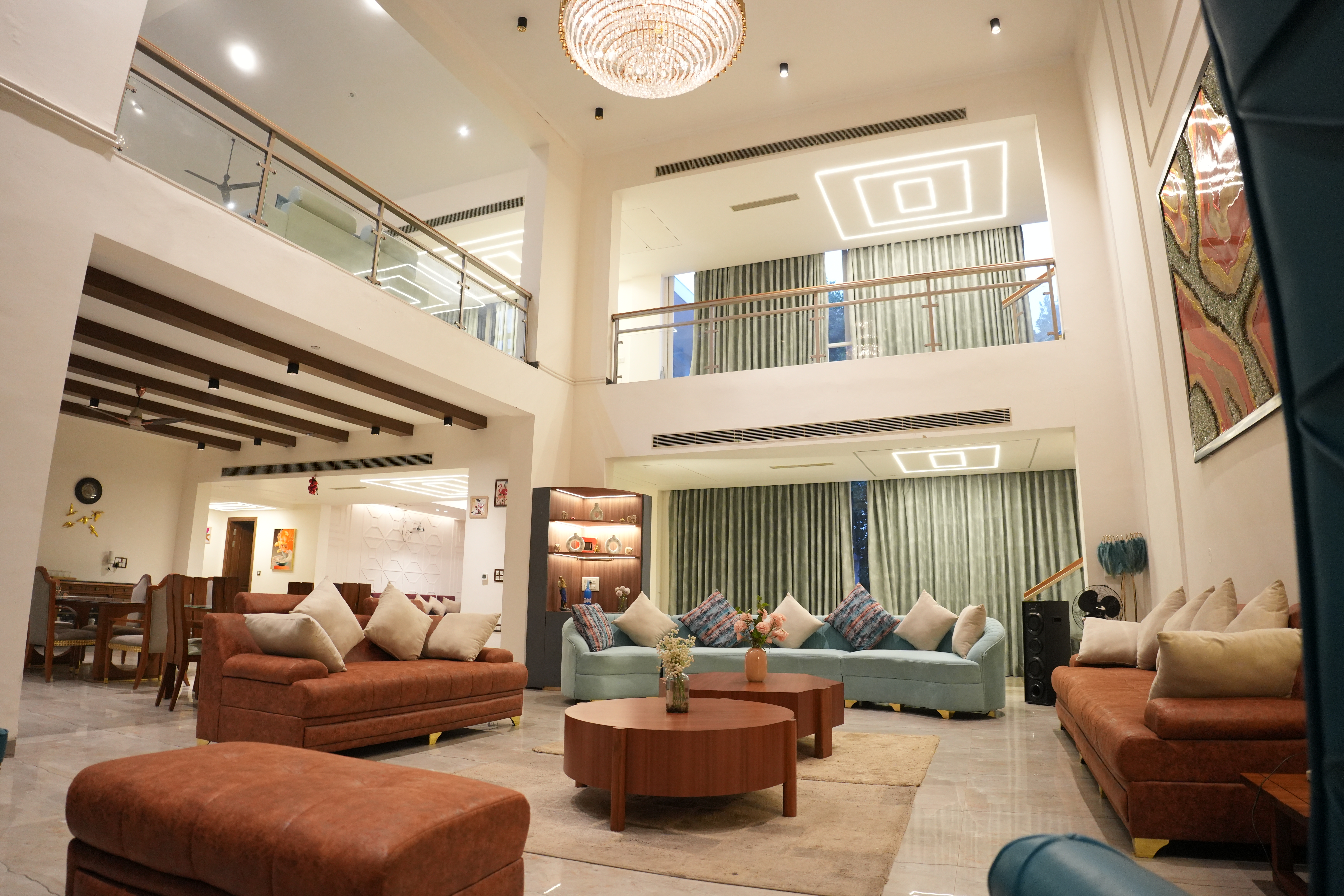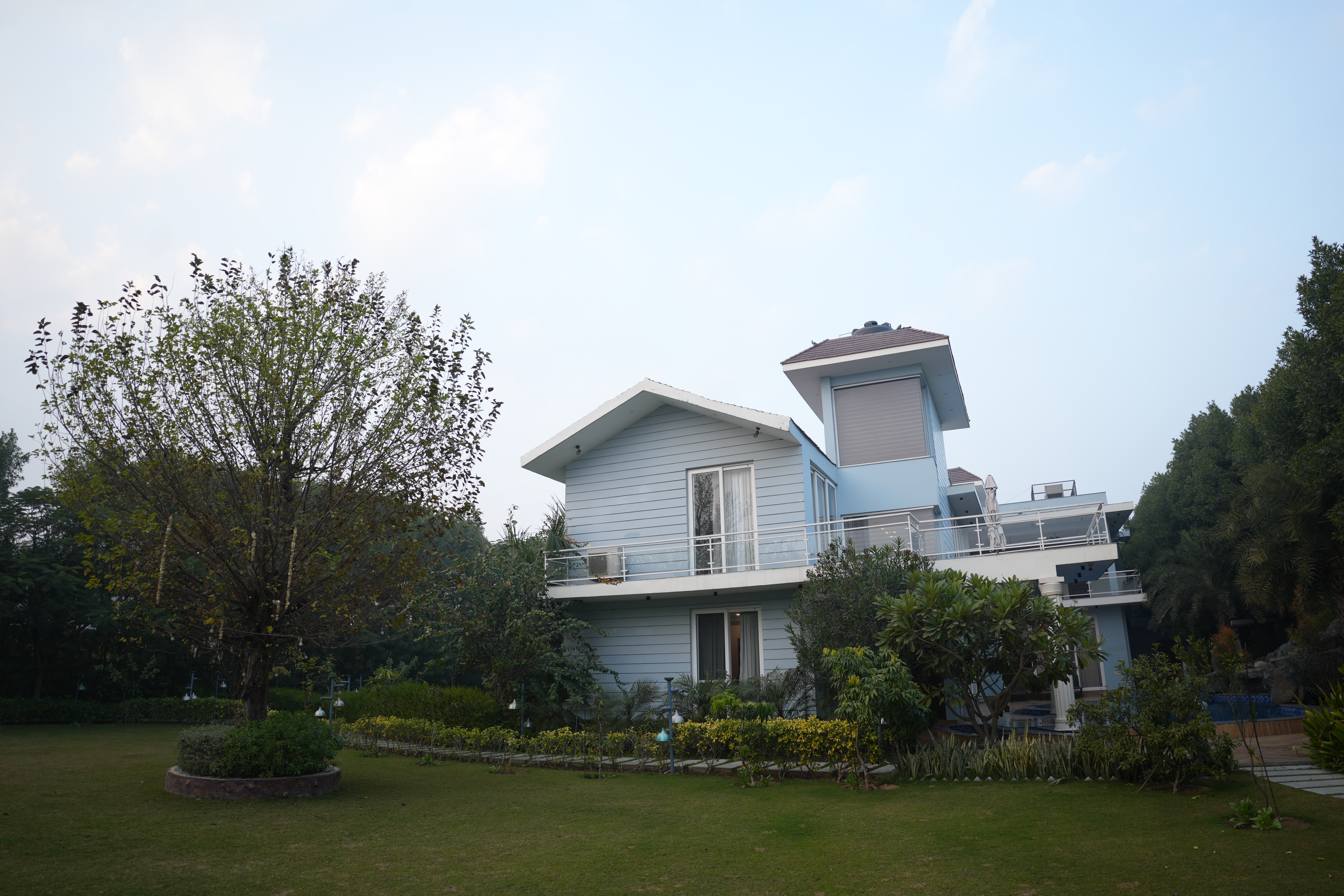 Indulge in luxury at this exquisite 5Bhk pool property, featuring a lush green lawn, a fully equipped kitchen, a poolside area, a spacious living room, and all essential