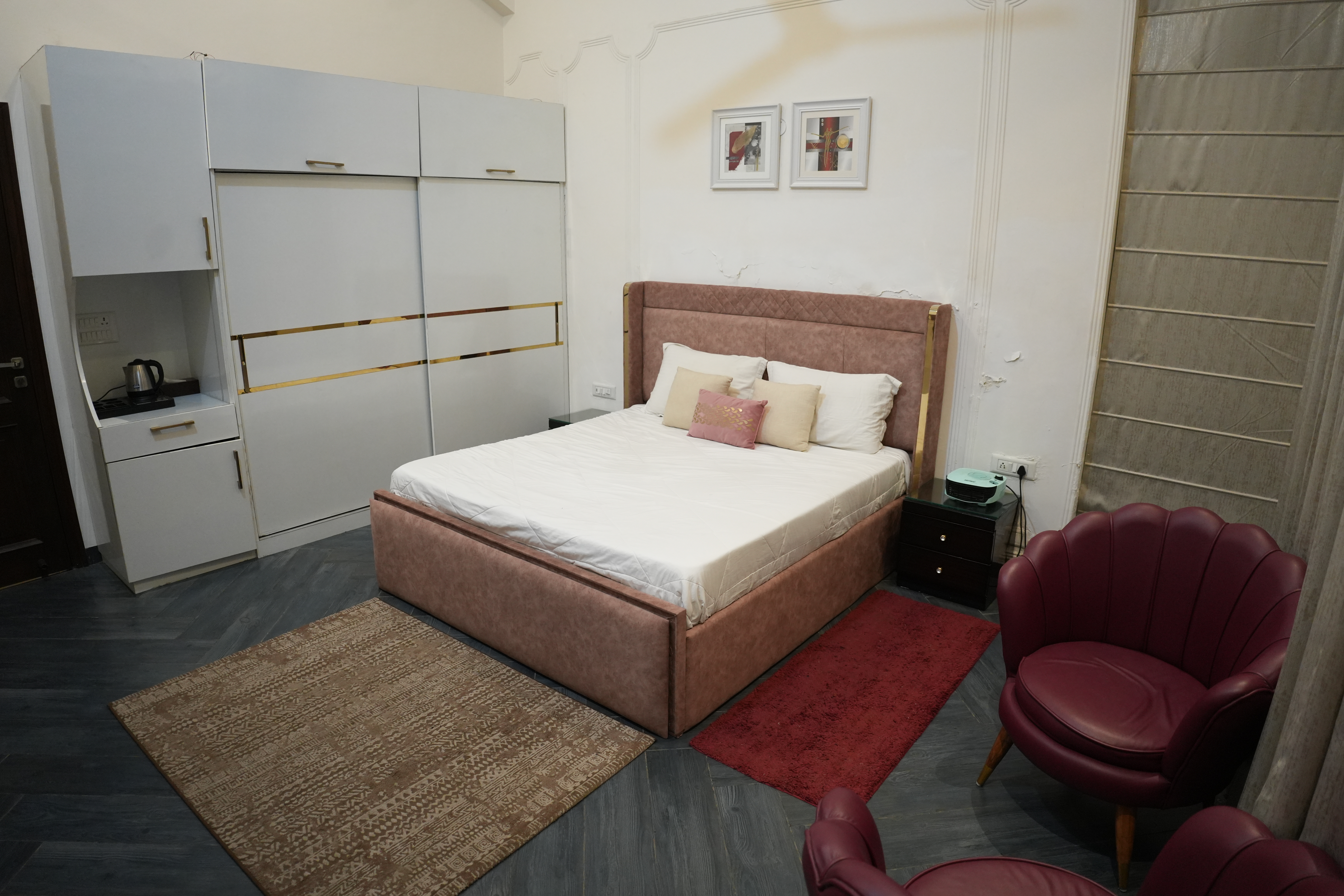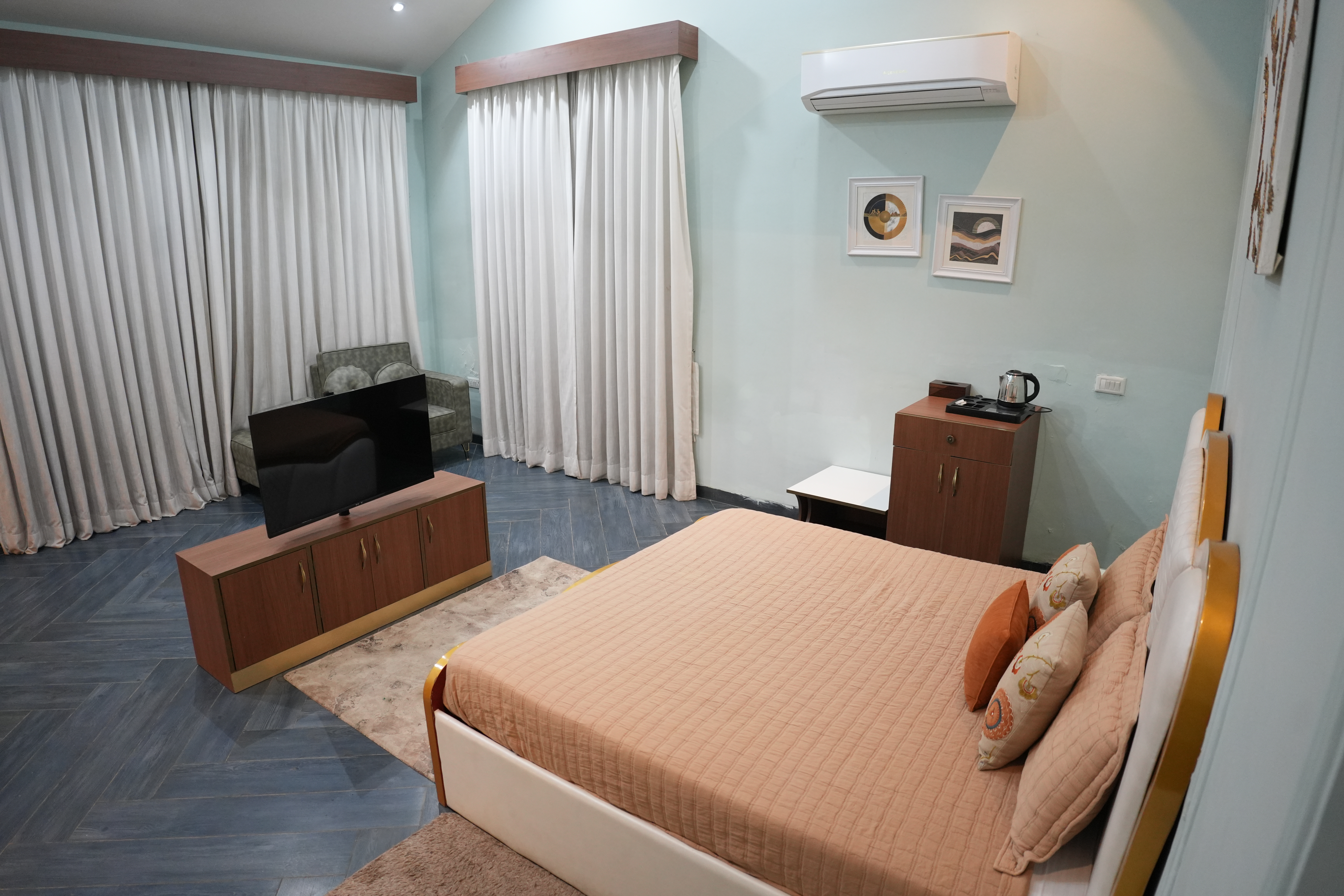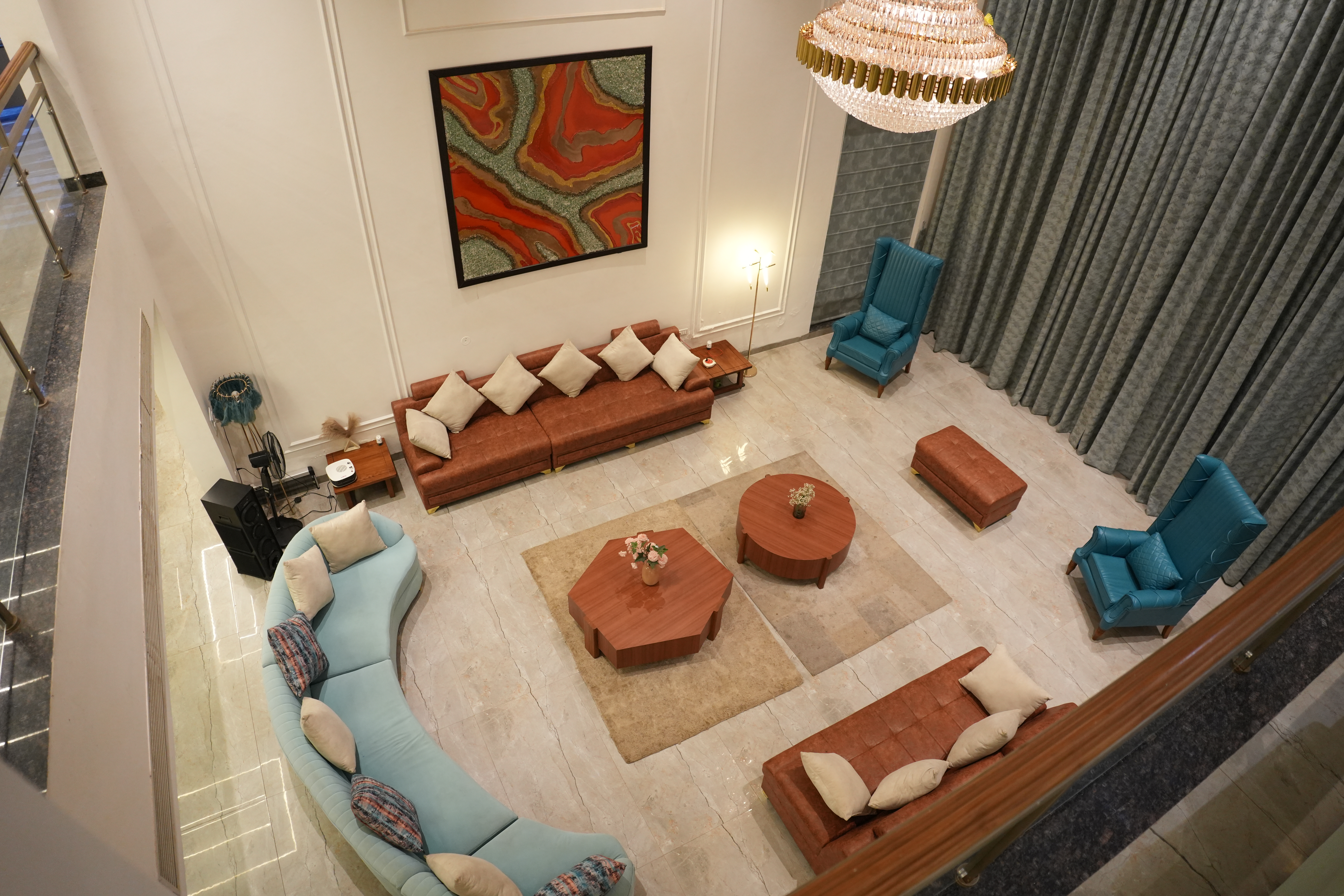 Indulge in luxury at this exquisite 5Bhk pool property, featuring a lush green lawn, a fully equipped kitchen, a poolside area, a spacious living room, and all essential