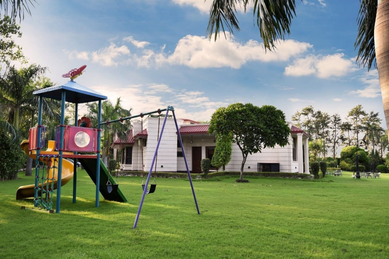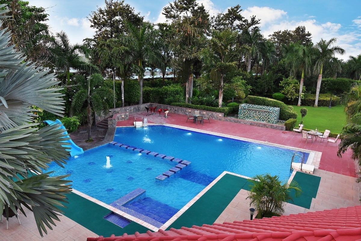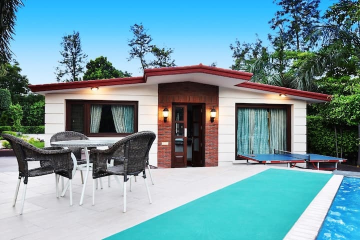 Indulge in luxury at this exquisite 3Bhk pool property, featuring a lush green lawn, a well-equipped kitchen, multiple seating areas by the poolside, a spacious living room, and all essential amenities. Experience a lavish retreat that offers both comfort and elegance for an unforgettable stay.