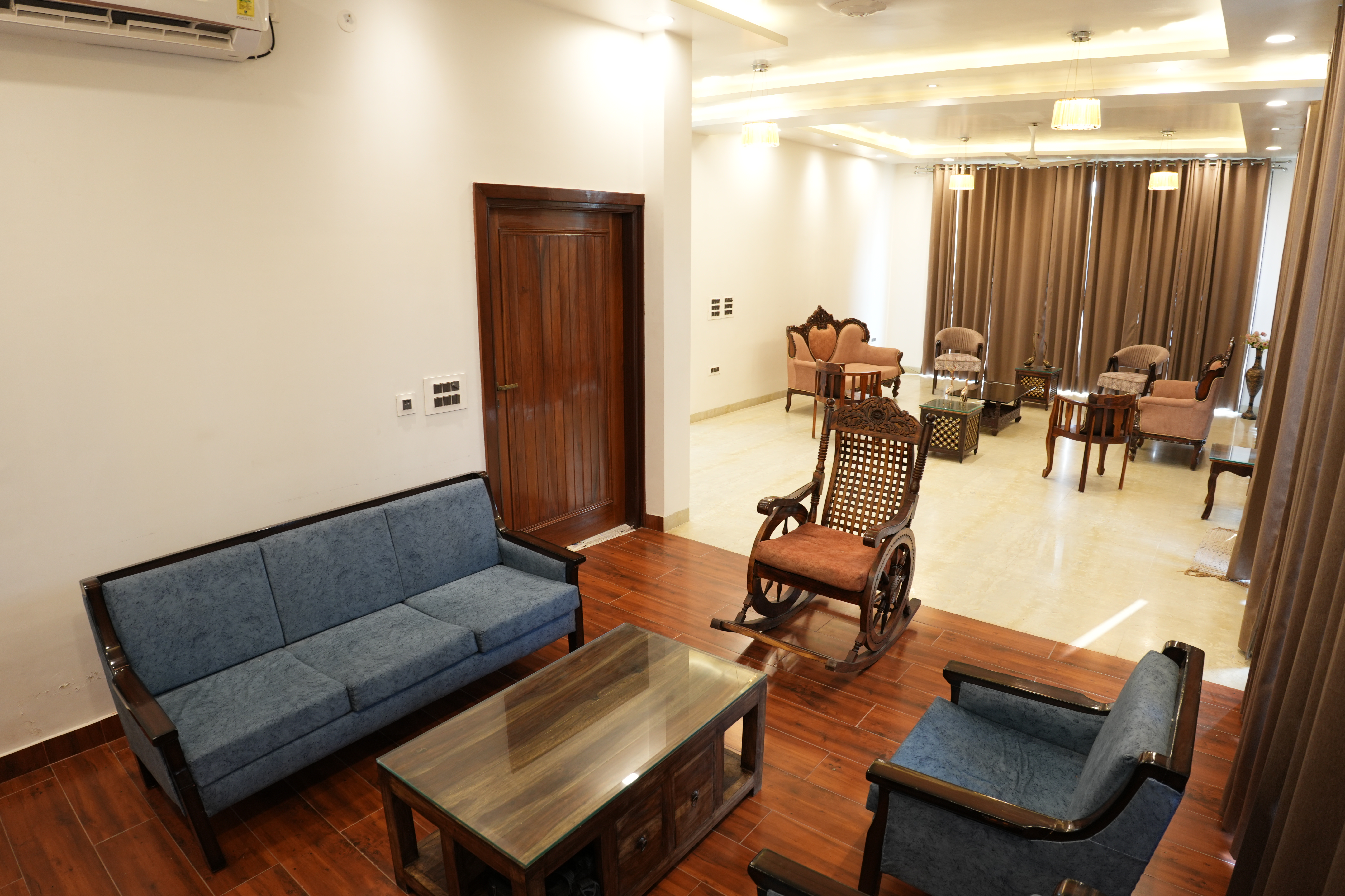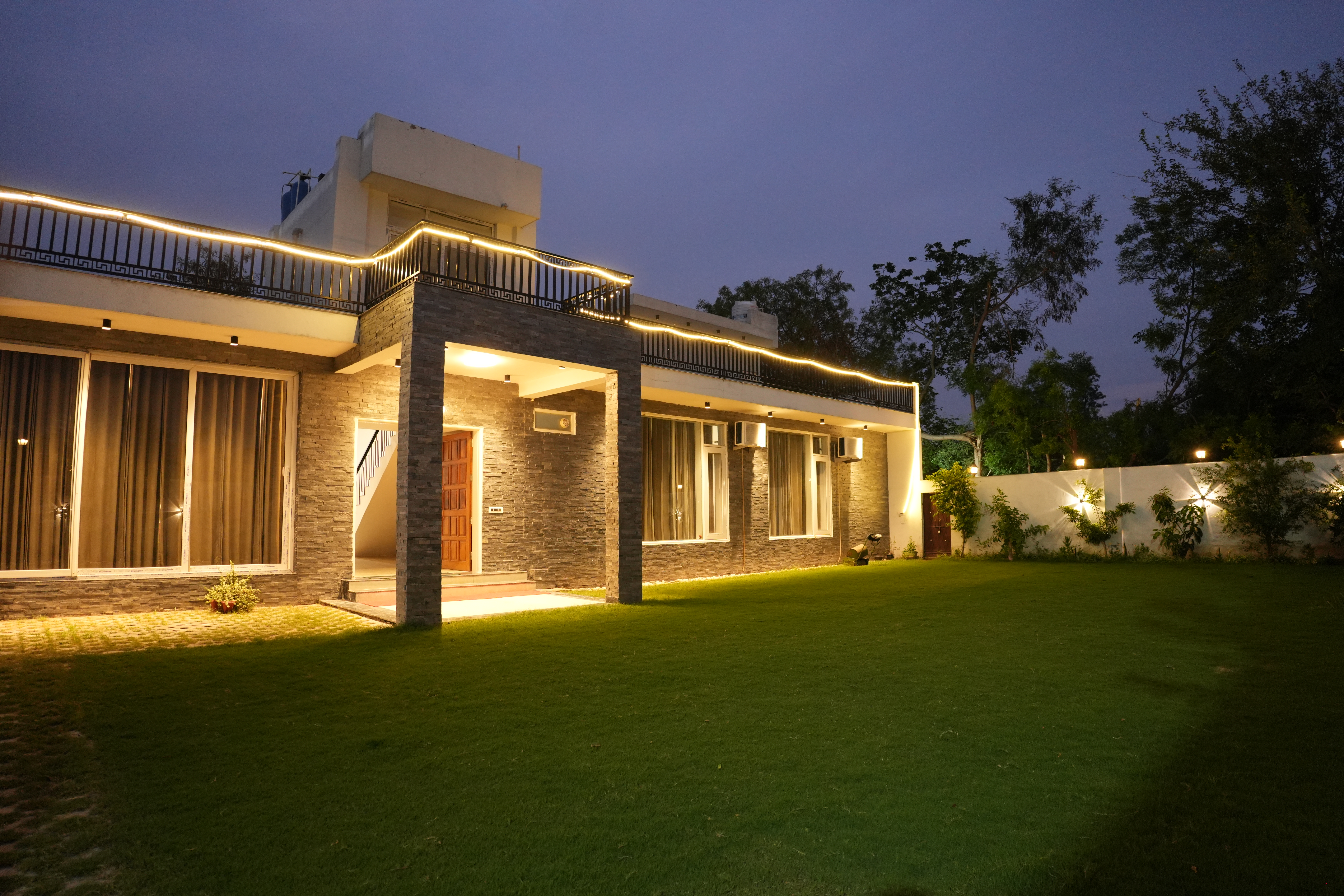 Indulge in the elegance of this exquisite 4Bhk property, where beautiful lighting illuminates the lush lawn, creating a captivating ambience. providing the perfect setting for relaxation and social gatherings. Experience luxury and sophistication in this remarkable retreat