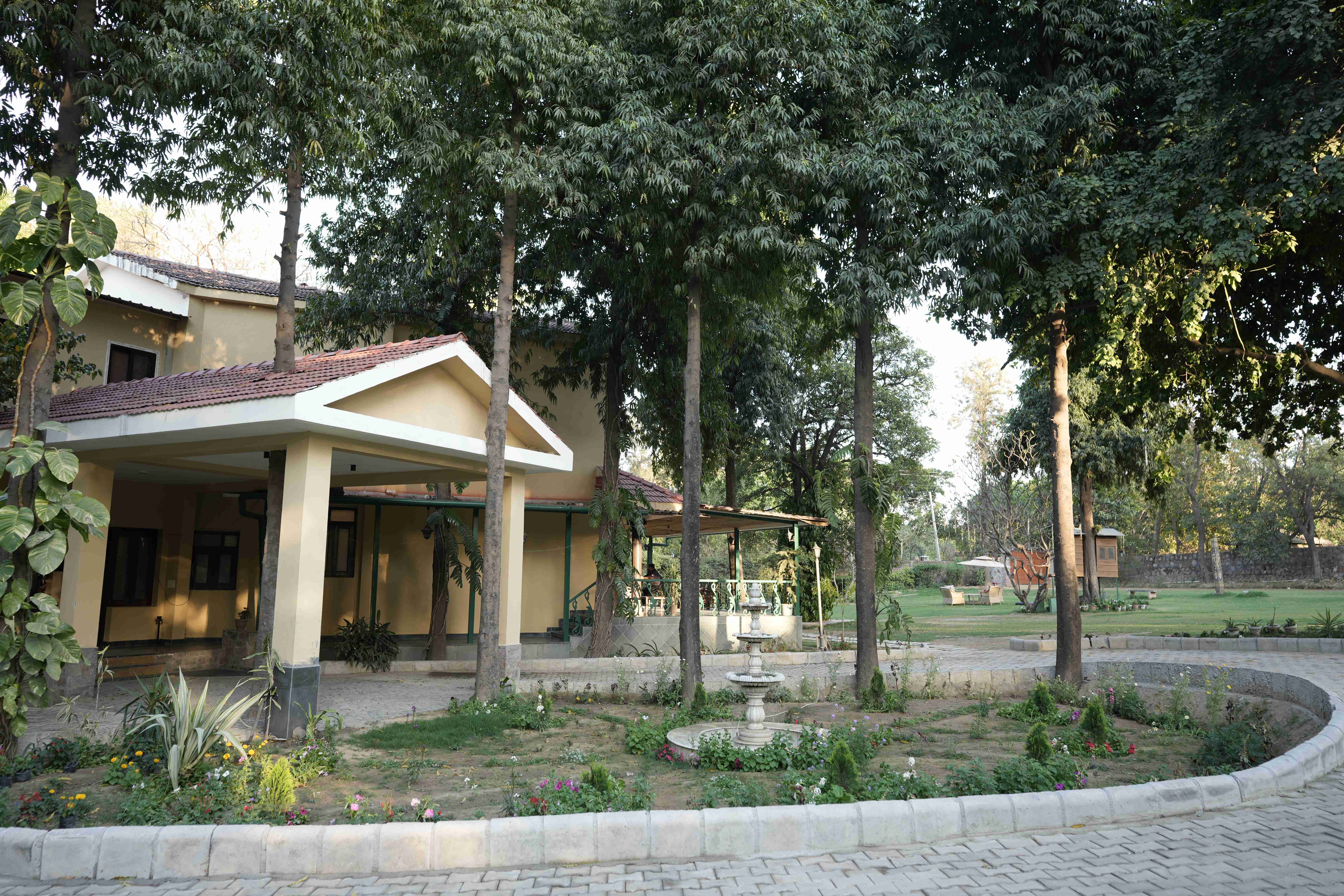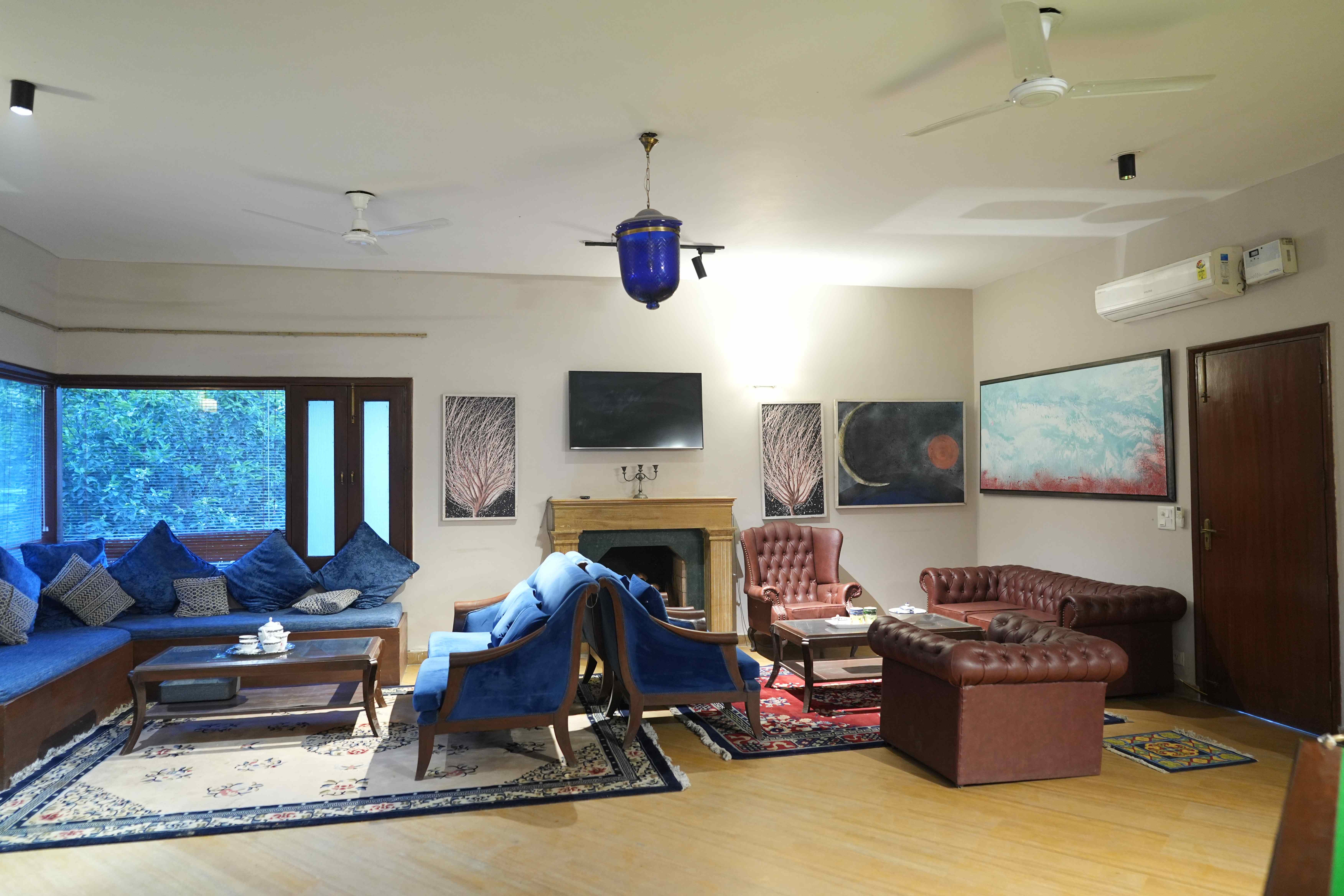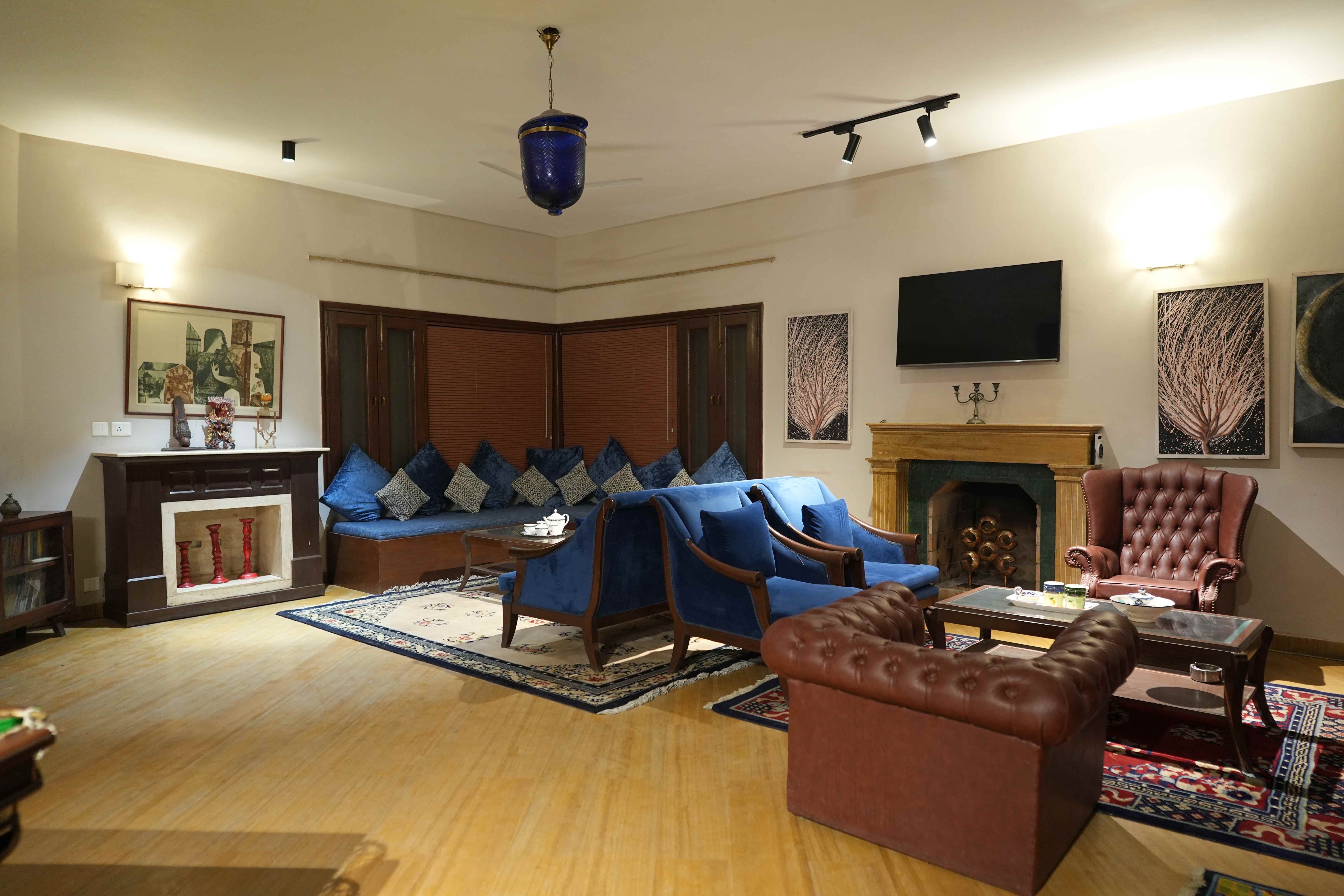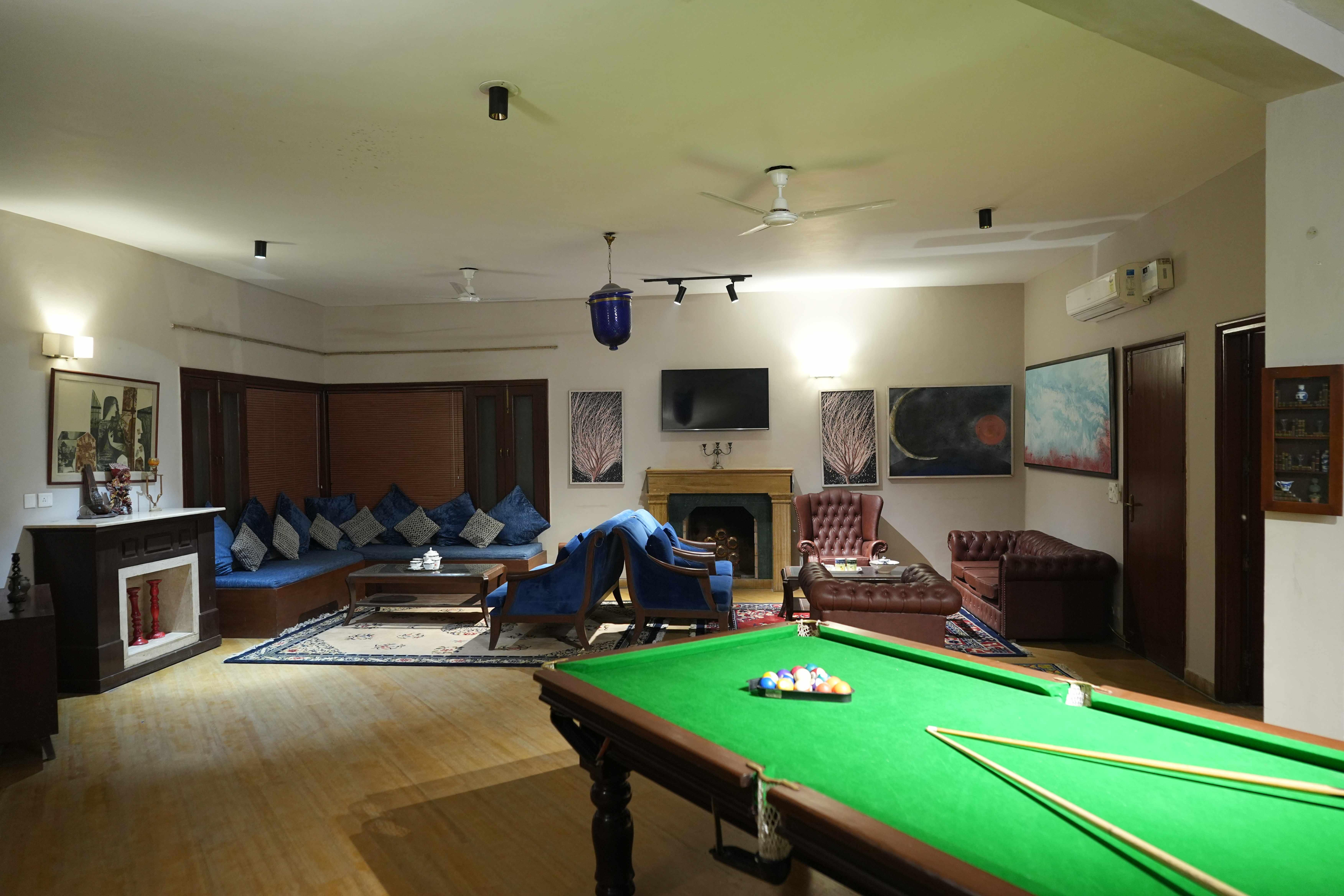 Indulge in luxury at this exquisite 6Bhk pool property, featuring a lush green lawn, a snooker